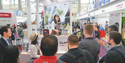 4月15日,在第123届广交会进口展区,来自韩国的企业在推销一款果汁机。新华社记者 梁旭摄