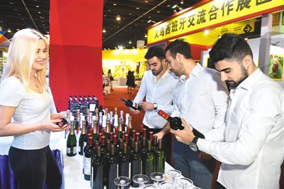 5月6日,2018中国义乌进口商品博览会在义乌国际博览中心开幕。展会为境外中小企业源头产品进入国内市场创造良好的贸易契机。图为阿塞拜疆客商在挑选西班牙红酒。