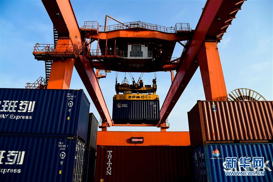 5月7日,在“中铁联集青岛中心站”,龙门塔吊往“青岛号”中亚国际班列上装载货物。 新华社记者 郭绪雷 摄