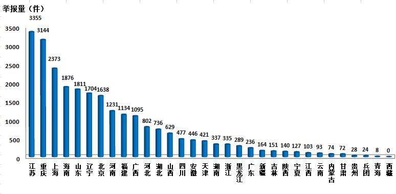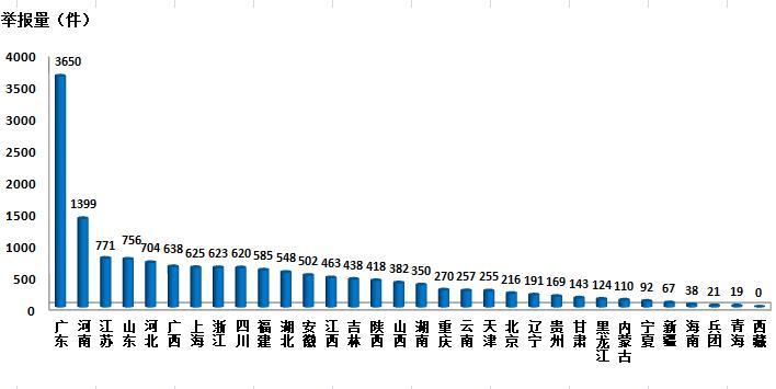 2018年3月,平台共接到网上举报6430件,相比上月增加3626件,环比增长129.3%;相比去年同期增加2126件,同比增长49.4%。其中广东、山东、河南三省公众使用网上举报相对频繁,举报数量合计约占全国总数的31.6%。