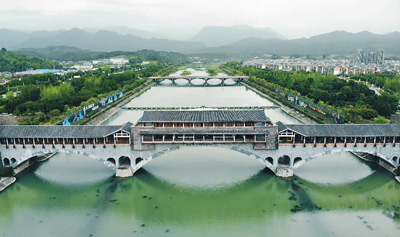 “5·12”汶川特大地震已经过去了整整十年,在那场举国悲痛的大灾难中幸存下来的人们开始了崭新的生活。如今的北川新县城坐落在安昌河畔,依山傍水,一条支流穿城而过。城市的建筑设计颇具浓郁的羌族特色。图为坐落在安昌河畔的禹王桥。韩 君摄(人民视觉)