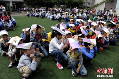 资料图:2014年4月17日,成都学校利用地震预警技术举行地震演习。安源 摄