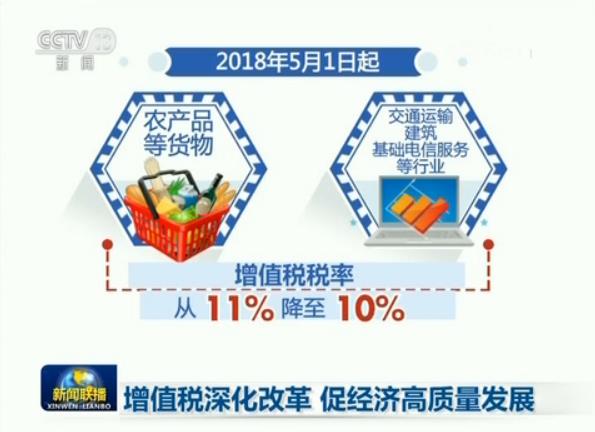 今年5月1日起,国家将制造业等行业增值税税率从17%降至16%。农产品等货物,以及交通运输、基础电信服务等行业的增值税税率从11%降至10%。