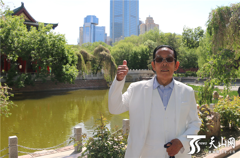 80岁的夏永熙精神矍铄,身着亮眼的白色西装在乌鲁木齐市人民公园鉴湖旁散步。