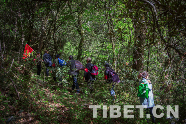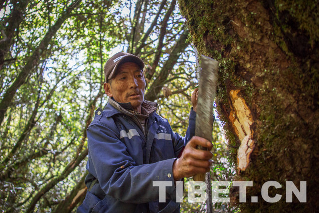 这天是勒村村民达瓦次仁巡边、护林的日子。58岁的他走在巡边队伍中间,步伐矫健,身手灵活。在这片密林之中,即使是巡边队员也不敢掉以轻心。为了防止迷路,达瓦次仁不时地用随身携带的刀具在巡边路上留下标记。