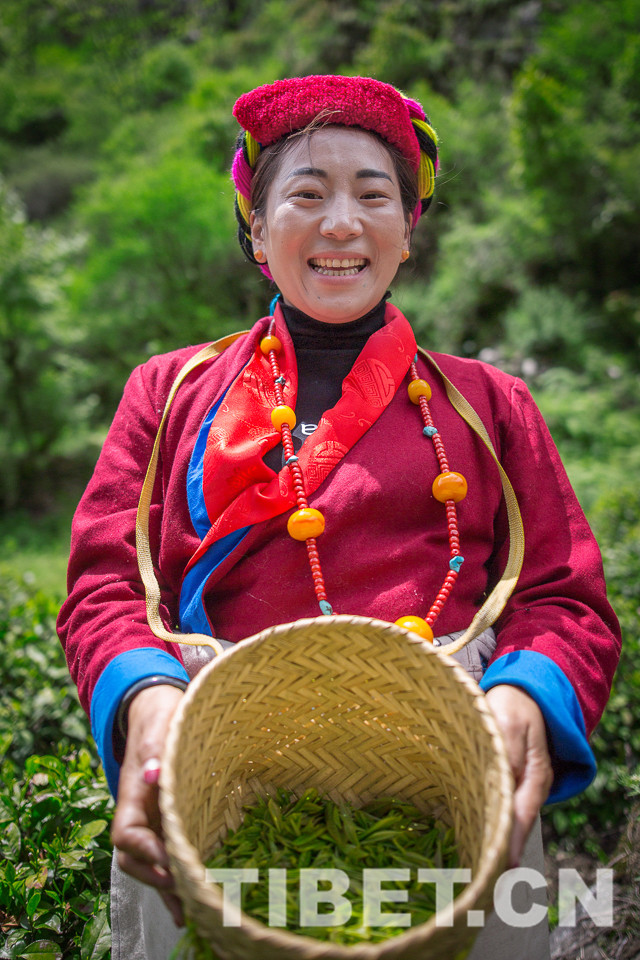 图为维色在展示新采摘的茶叶。