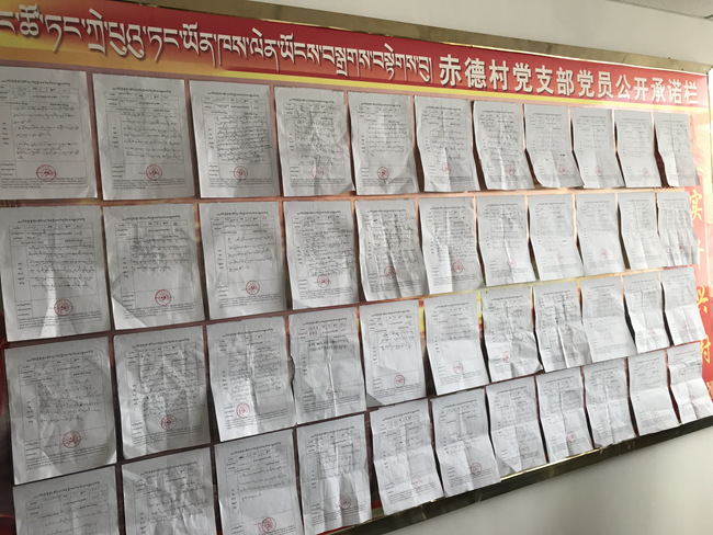在赤德村党支部书记次旺欧珠的办公室里,有一面党支部党员公开承诺栏,上面挂满了赤德村党员亲手写下的承诺书。他表示,“党员亲手写承诺书的规矩已经有十几年了,我们一起开会后,定下对村民的承诺,并积极为村民服务。”