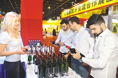 五月六日,二○一八中国义乌进口商品博览会在义乌国际博览中心盛大启幕。图为阿塞拜疆客商在挑选西班牙红酒。
