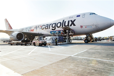 近年来,不沿边、不靠海、不临江的河南紧抓“一带一路”机遇,大力发展航空港经济,拓展开放型经济发展新格局。图为机场工作人员在新郑国际机场卸载欧盟货机上的商品。