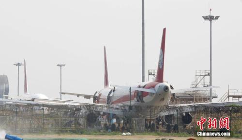 5月14日17时,成都机务人员正在对注册号为B-6419的空客A319客机进行检查,破损的右侧风挡玻璃处已经被临时遮挡。中新社发 汪龙华 摄