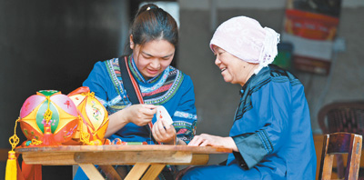 5月15日,在广西靖西市新靖镇旧州街,年过七旬的黄肖琴(右)坐在家门口,向邻居蓝丽梅传授绣球制作技艺。
