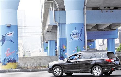 江苏连云港市连云区院前路跨陇海铁路立交桥,“涂鸦”后的桥墩变成了海底世界。近日,连云港市连云区院前路跨陇海铁路立交桥40多座桥墩经过人工彩绘后,原本“灰头土脸”的桥墩出现了海洋中的海马、鱼类、水草等画面,经过这里的市民仿佛置身于海底世界。 耿玉和摄