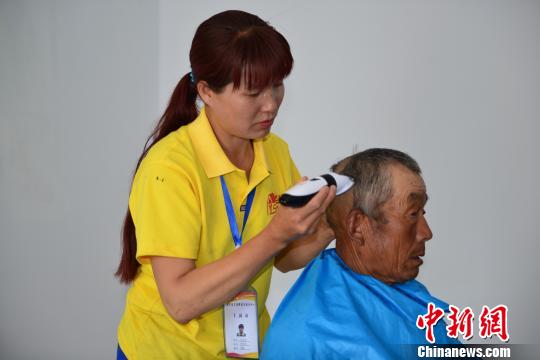 图为西宁市湟中县林马村老年之家工作人员为老人剃头发。 丁洪 摄