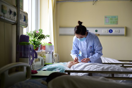 山东省青岛市交通医院专护病房的90后护士王晓燕正在照顾104岁的患者,她的工作就是让生活不能自理的老人体面地活着。视觉中国供图