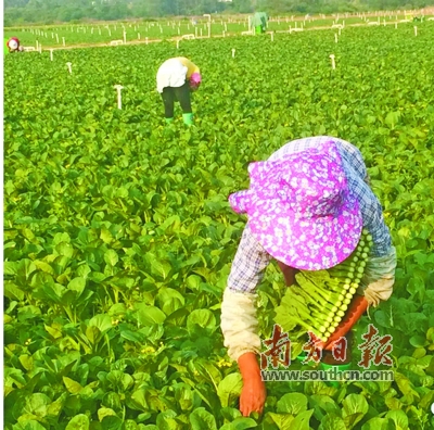这片基地以种植菜心、大白菜、通心菜、奶白、上海青、豆苗等产品为主,带动周边80多户农户(其中建档立卡贫困户共计6人)种植蔬菜,年产量达1050吨。合作社严格执行无公害蔬菜生产操作技术规程,蔬菜主要由配送中心直供当地学校、超市、市区农贸市场,已成为河源市近郊主要蔬菜生产供应、辐射示范基地,规模化、标准化、品牌化、产业化经营初见成效。