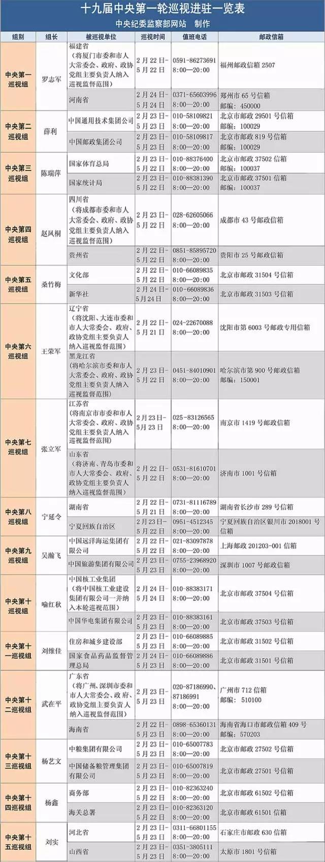 十九届中央第一轮巡视进驻一览表(中央纪委监察部网站)