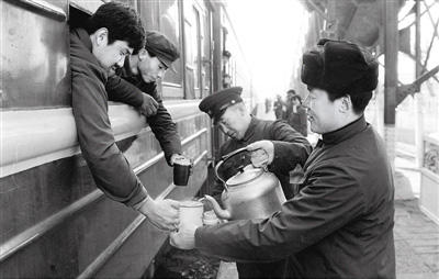 1984年春节期间,在石家庄火车站,工作人员为过往旅客送开水。
