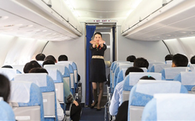 5月2日,在由黑河飞往哈尔滨的EU2796航班国产喷气客机ARJ21飞机上,工作人员在进行安全指导。