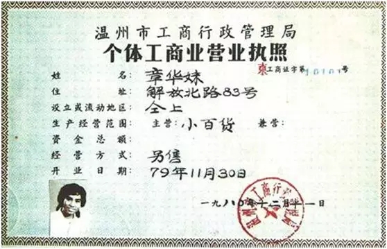 1980年12月11日,卖纽扣的19岁温州姑娘章华妹,如愿以偿地从温州市工商行政管理局领到了第一张“个体工商户营业执照”——工商证字第10101号。