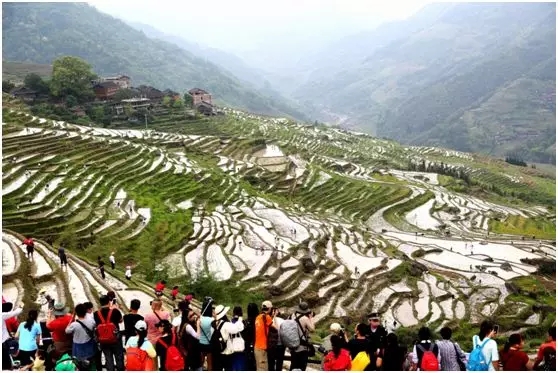 ▲ 2018年4月30日,游客在广西龙胜龙脊古壮寨观赏梯田美景。2018年“五一”假日,国内旅游收入871.6亿元,同比增长10.2%。新华社发(王滋创 摄)