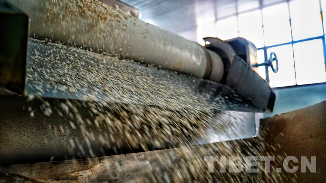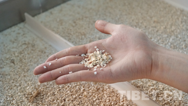 图为青稞片加工流水线,青稞片的工艺、口感与麦片类似,但风味独特。摄影:杨悦笙