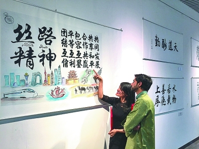 5月19日,上合组织国家中文书法大赛在北京举行。图为获奖的印度和巴基斯坦参赛者正在欣赏现场展出的作品。本报记者 李曾骙摄/光明图片
