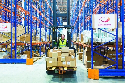 工作人员在位于俄罗斯莫斯科东南部的一家中国跨境电商物流企业的海外仓运送货物。新华社发
