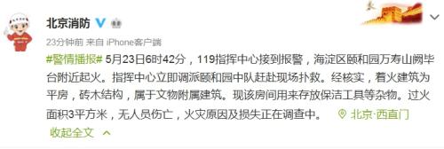 据北京市公安局消防局官方微博消息,5月23日6时42分,119指挥中心接到报警,海淀区颐和园万寿山阙毕台附近起火。指挥中心立即调派颐和园中队赶赴现场扑救。