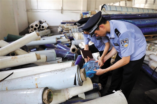 ▲ 黄埔海关缉私局民警查看走私进口的废塑料薄膜 马汉青 濮宣 摄