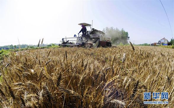 5月23日,在湖北省襄阳市襄城区尹集乡尤河村,农民驾驶农机收割小麦。新华社发(安富斌 摄)