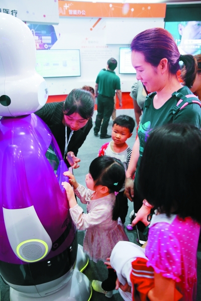 儿童观众与展厅人工智能小I机器人互动。光明日报记者 康薇薇摄/光明图片