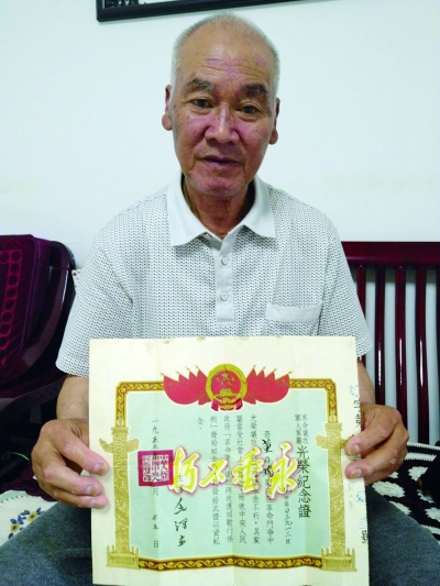 董存金手捧哥哥董存瑞烈士“光荣牺牲,永垂不朽”的纪念证