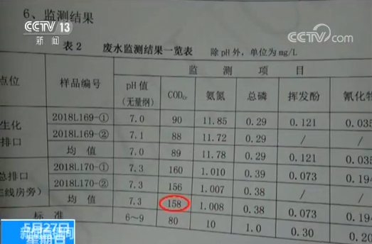 为了验证监测数据的真实性,记者来到景德镇市环境监测站,市环保局对开门子焦化废水每月一次的监督性监测报告数据显示,4月份总排口COD的浓度均值为158毫克每升,超过企业法定排放标准1倍,企业监测数据严重失实。