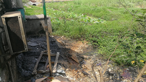 一家县城周边的农庄,餐厨污水、废弃物长时间排放到一个小水塘,堆满了黑色或黄色的湿乎乎、粘稠状污物,旁边紧邻着稻田和一条灌溉水渠。记者 白田田 摄
