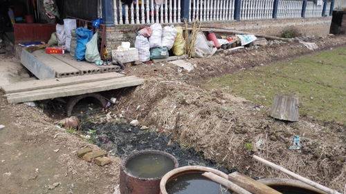 一个主打“土鸡土菜”的农家乐,餐厨废水直接排到屋后的水渠,长年累月形成了黑色油腻的泥垢。记者 白田田 摄