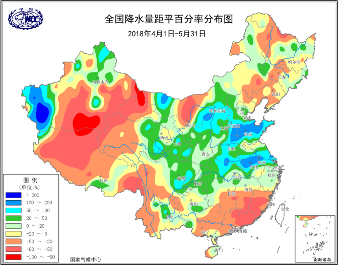 陈丽娟:4月以来,我国气候波动较大,雨季进程偏晚,虽然全国平均降水量接近常年同期,但降水呈现“北多南少”格局,空间分布极不均匀。主要特点有: