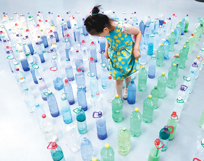 6月2日,一名小女孩在为世界环境日而创作的环境艺术作品中玩耍。