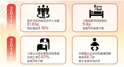 2017年,我国医疗质量呈现“四升一降”的趋势。一是医疗资源供给持续增加。2017年全国医疗卫生机构总诊疗人次数约为81.83亿,较2016年和2014年分别增加3.16%和7.64%。二是医疗服务效率有所提升。2017年三级和二级医院平均住院日分别为9.8天和8.7天,较2016年分别下降0.3天和0.1天,实现5年连续下降。三是部分专科、重点病种和手术诊疗质量稳中有升。如麻醉技术应用人群从子宫内胎儿、新生儿到百岁老人,扩大了手术麻醉服务的可及性。我国麻醉相关死亡率约为12/百万,显著低于141/百万的发展中国家平均水平,与发达国家的10/百万左右相当。四是临床合理用药水平不断提升。2016年门诊、住院患者抗菌药物使用率从2010年的22.0%和68.7%分别下降到8.7%和37.5%,细菌耐药趋势总体平稳。五是住院患者死亡率持续下降并稳定在较低水平。三级公立综合医院住院患者总死亡率由2014年的0.74%下降至2016年的0.67%,实现连续3年下降。