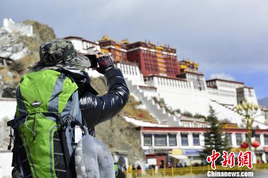 图为“冬游西藏”活动期间,游客在布达拉宫前拍照。 周文元 摄