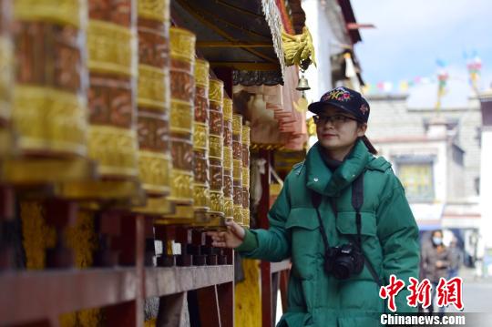 图为“冬游西藏”活动期间,游客在转动八廓街上的转经筒。 周文元 摄