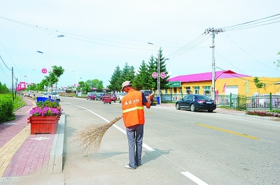 黑龙江省方正县大罗密镇大罗密村保洁员在清扫街道。光明图片