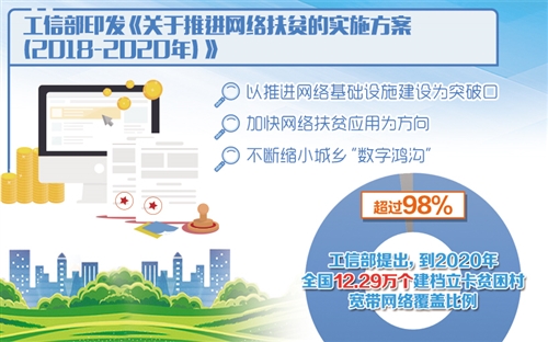 工业和信息化部网站6月6日显示,工信部近日印发《关于推进网络扶贫的实施方案(2018—2020年)》,要求以推进网络基础设施建设为突破口,加快网络扶贫应用为方向,不断缩小城乡“数字鸿沟”。《方案》提出,到2018年,国家“十三五”规划纲要明确提出的“宽带网络覆盖90%以上的贫困村”目标提前完成;到2020年,全国12.29万个建档立卡贫困村宽带网络覆盖比例超过98%。