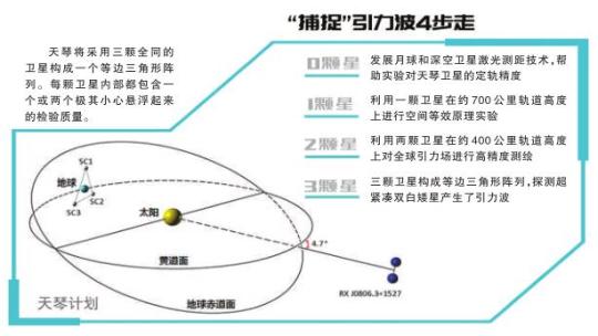 LIGO是探测到引力波的第一个天文机构。但LIGO是在地面上探测引力波。地面观测仪器因臂长较短,只能接收到高频引力波。“天琴”是将三颗卫星放在太空里,星间距离可以足够长,因此可以探测到低频引力波,捕获更丰富的物理、天文学过程。