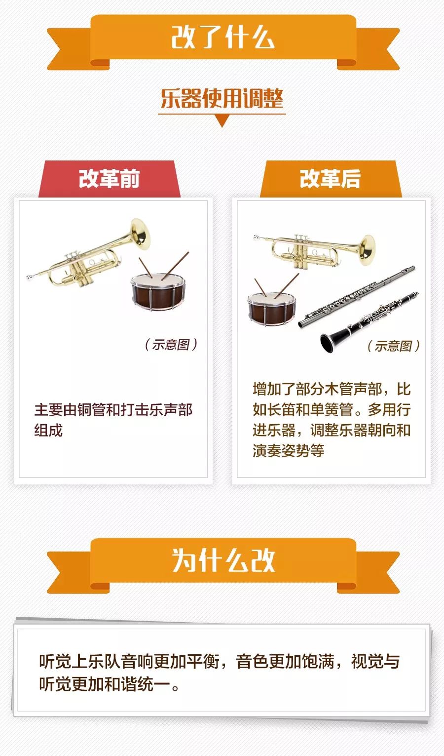 改革亮点四:吹奏表演有变化 四年之前,军乐团队列行进吹奏表演首次出现在了习主席欢迎外国元首的仪式上。这次改革又做了多处重大调整。