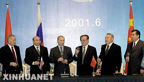2001年6月14日至15日,上合组织成员国元首理事会首次会议在中国上海举行。与会成员国元首签署了《上海合作组织成立宣言》,宣告上合组织正式成立。