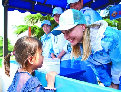 在青岛香港中路的一处志愿服务驿站,留学生志愿者(前右一)在用汉语与一名小女孩交流。新华社发