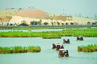 游客在沙湖乘坐游船观鸟游览。新华社记者 王鹏摄