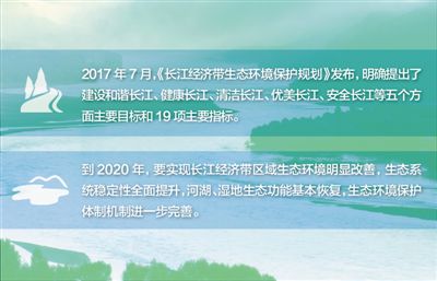 长江大保护,规划先行。2016年,《长江经济带发展规划纲要》印发。去年7月,《长江经济带生态环境保护规划》发布,提出了建设和谐长江、健康长江、清洁长江、优美长江、安全长江等五个方面主要目标和19项主要指标——到2020年,要实现长江经济带区域生态环境明显改善,生态系统稳定性全面提升,河湖、湿地生态功能基本恢复,生态环境保护体制机制进一步完善;地表水质量国控断面(点位)达到或优于Ⅲ类水质比例达到75%以上,劣Ⅴ类比例小于2.5%,地级及以上城市集中式饮用水水源水质达到或优于Ⅲ类比例达到97%以上。