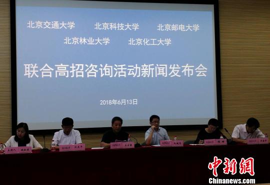 北京邮电大学、北京交通大学、北京科技大学、北京林业大学、北京化工大学五所高校6月13日在北京举办联合高招咨询活动新闻发布会。 马海燕 摄