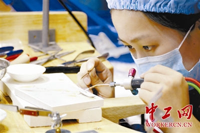 6月13日,一名珠宝加工项目参赛选手正在作业。当日,2018年中国技能大赛——第45届世界技能大赛全国选拔赛上海赛区的比赛,在位于上海的国家会展中心拉开战幕,来自全国46个代表队的约900名选手,将在汽车技术、木工、机电一体化和社会照护等34个比赛项目中进行技能比拼。 工人日报-中工网记者 窦菲涛 摄